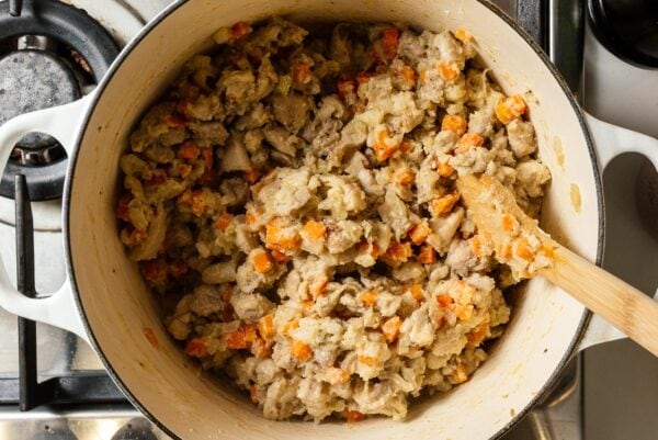 - Sauté – Sauté the onion, garlic, and carrots in butter until slightly soft and aromatic. Add the chicken to the pan, season with salt and pepper, and cook lightly, stirring as needed. At this point, the chicken doesn’t need to cook through, as it will continue cooking as the sauce thickens.