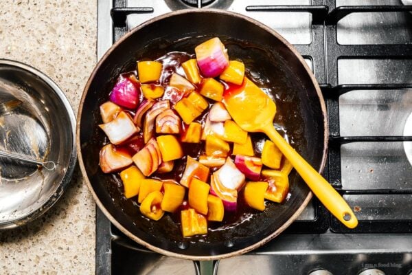 - Pineapple or no pineapple? Usually there’s pineapple in sweet and sour dishes but we didn’t have any on hand and I didn’t want to go out and buy a can (or chunk). Feel free to add any vegetables in – any crunchy, juicy vegetable is always a good bet – such as the red onion and yellow peppers in the photos. Pineapple is classic though, and fresh is best!
